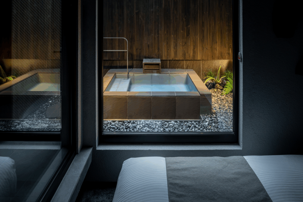 京都の中心部にありながら、静寂に包まれた大人の隠れ家的リゾート。2階建ての町屋を一棟貸切できる露天風呂付きの客室で、古都京都の四季を感じながら温泉を楽しめる特別な宿です。