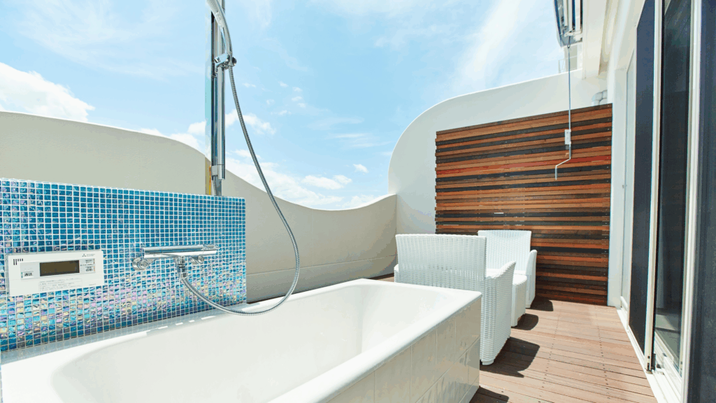 - 日本初の電動開閉式露天風呂が全室に付く宿